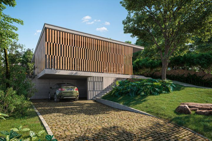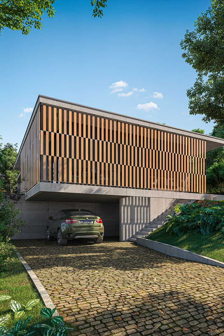 Não menos encantador é a volumetria e a plasticidade do projeto logo na chegada. Aproveitando o desnível existente entre a edificação e o acesso dos carros a sala avança sobre este espaço livre de pilares, é uma treliça em concreto armado que permite a sala flutuar sobre a garagem principal. Uma marquise borda o espaço que recebe uma estrutura de aço e madeira criando um brise que suaviza a incidência solar no mesmo tempo que permite um jogo de luz e sombra.