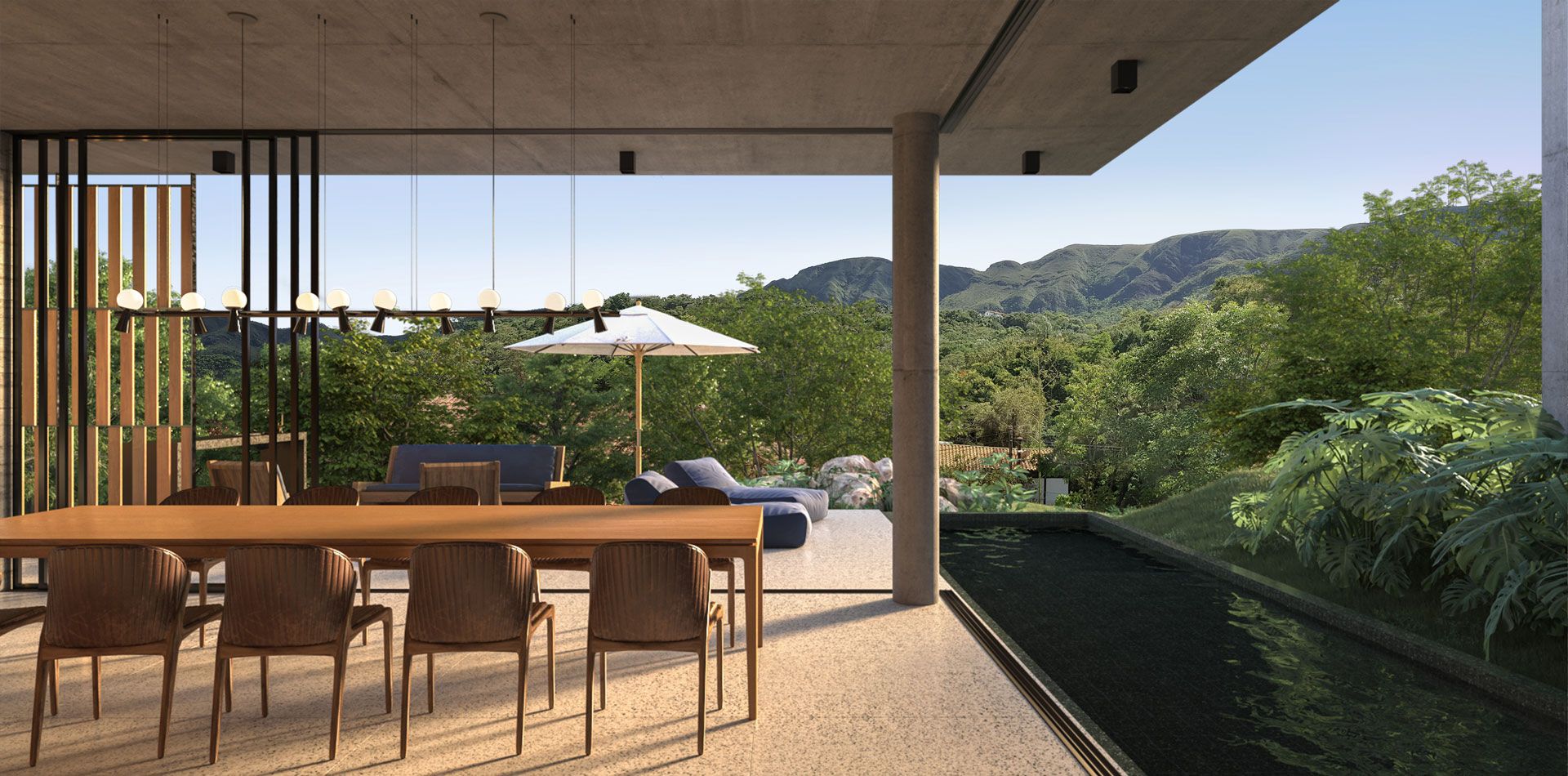 Um espaço central, um ́pátio ́ entre quartos e sala, onde a vida da casa acontecesse esteve nos insights iniciais, mas foi a topografia e o entorno quem tiveram a premissa pela proposta arquitetônica apresentada pela nossa parceira Kubus Arquitetura. A principal área social da casa se manteve no encontro de quartos e sala, mas toda a casa se curvou a beleza da vista da Serra da Moeda gerando um projeto em estilo linear todo voltado pro lado da serra.