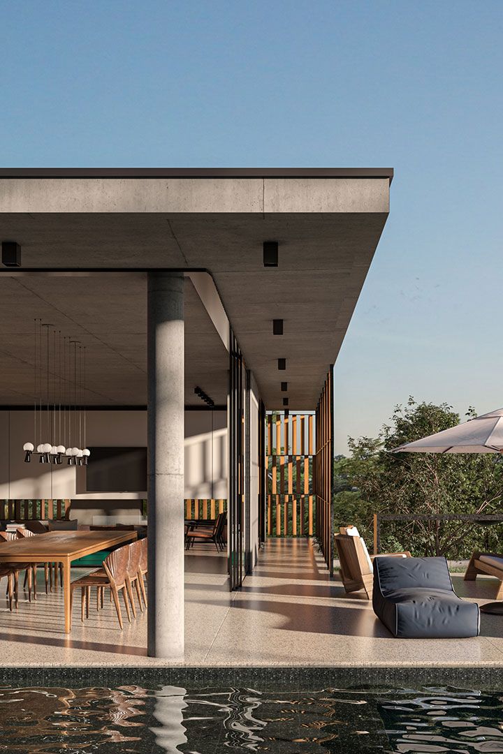 Hoje, na maioria das vezes são os proprietários que comandam a cozinha recebendo os amigos ou cozinhando com a família, o fogão já trocou a TV como principal elo social da casa. Por isso, a cozinha especial está integrada na casa, permitindo uma visão 360 graus de tudo que acontece. Nas edificações da R21 a cozinha é sempre o ponto máximo da casa. Pilotando um fogão você assiste a TV, vê as crianças brincando na água, observa a Serra da Moeda, conversa com o home office ao lado e ainda tem atrás de você uma pequena cozinha de apoio. Pra lá você pode deixar toda bagunça pra depois, ter uma ajuda de um buffet ou uma cozinheira num dia mais cheio ou simplesmente fritar um bife.
